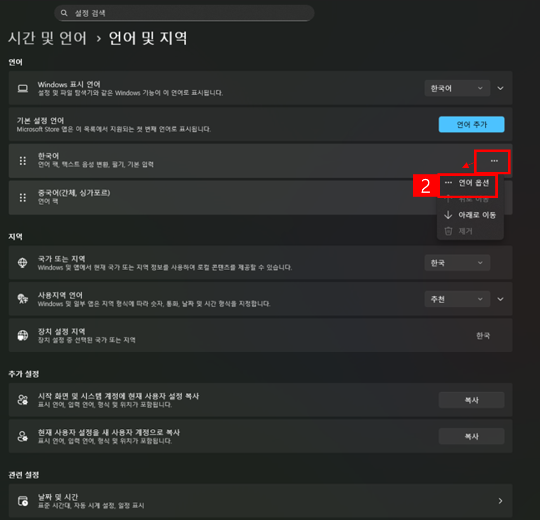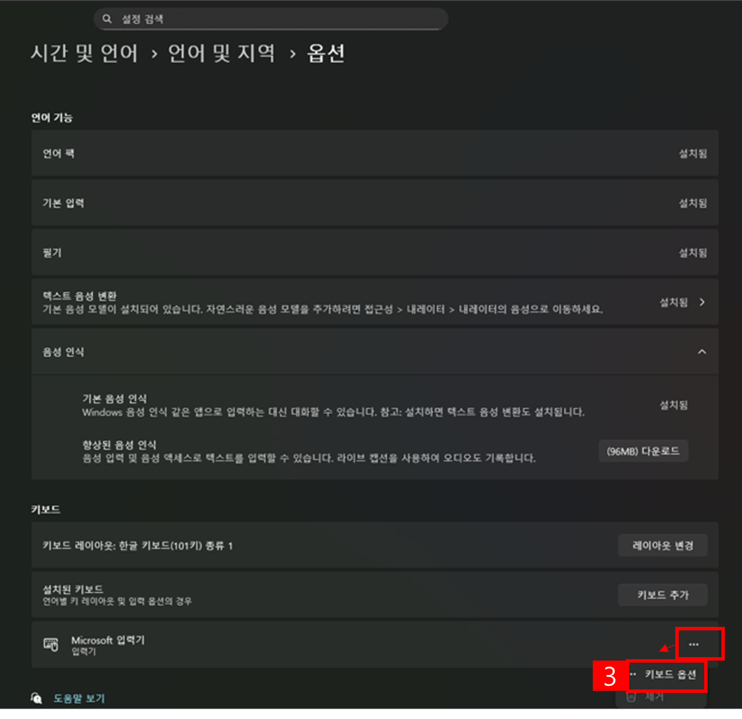 언어 목록에서 ‘한국어’ 오른쪽의 더보기(⋯) 버튼을 클릭한 후 [언어 옵션]을 선택합니다.