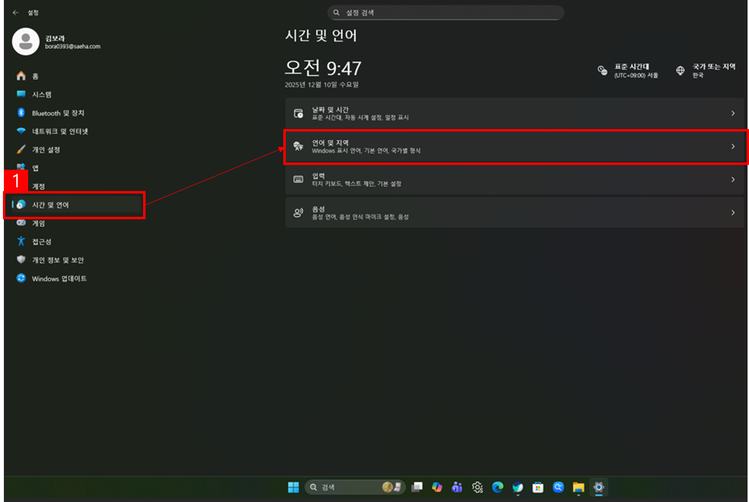 시작 메뉴 → 설정 → 시간 및 언어 → 언어 및 지역으로 이동합니다.