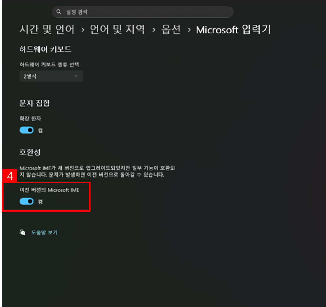 ‘이전 버전의 Microsoft IME 사용’ 스위치가 꺼져 있다면 켬으로 변경합니다.