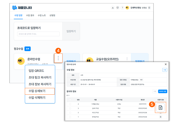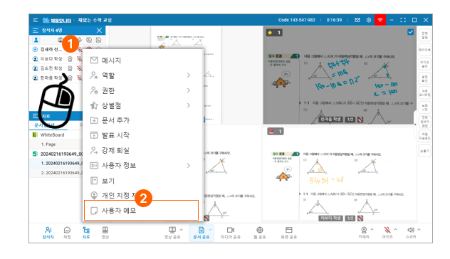 1. 참석자 목록에서 학생 이름을 [마우스 우클릭]