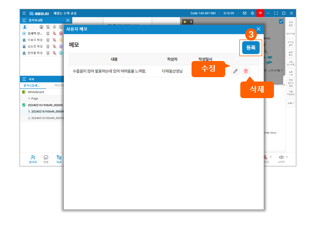 3. [등록] 버튼을 클릭하여 학생에 대한 메모 기록 후 수정, 삭제 하기